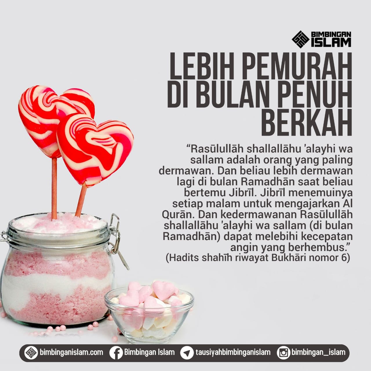 _“Rasūlullāh shallallāhu ‘alayhi wa sallam adalah orang yang paling dermawan. Dan Beliau lebih dermawan lagi di bulan Ramadhān saat Beliau bertemu Jibrīl. Jibrīl menemuinya setiap malam pada bulan Ramadhān untuk mengajarkan Al Qurān. Dan kedermawanan Rasūlullāh shallallāhu ‘alayhi wa sallam melebihi angin yang berhembus.”_