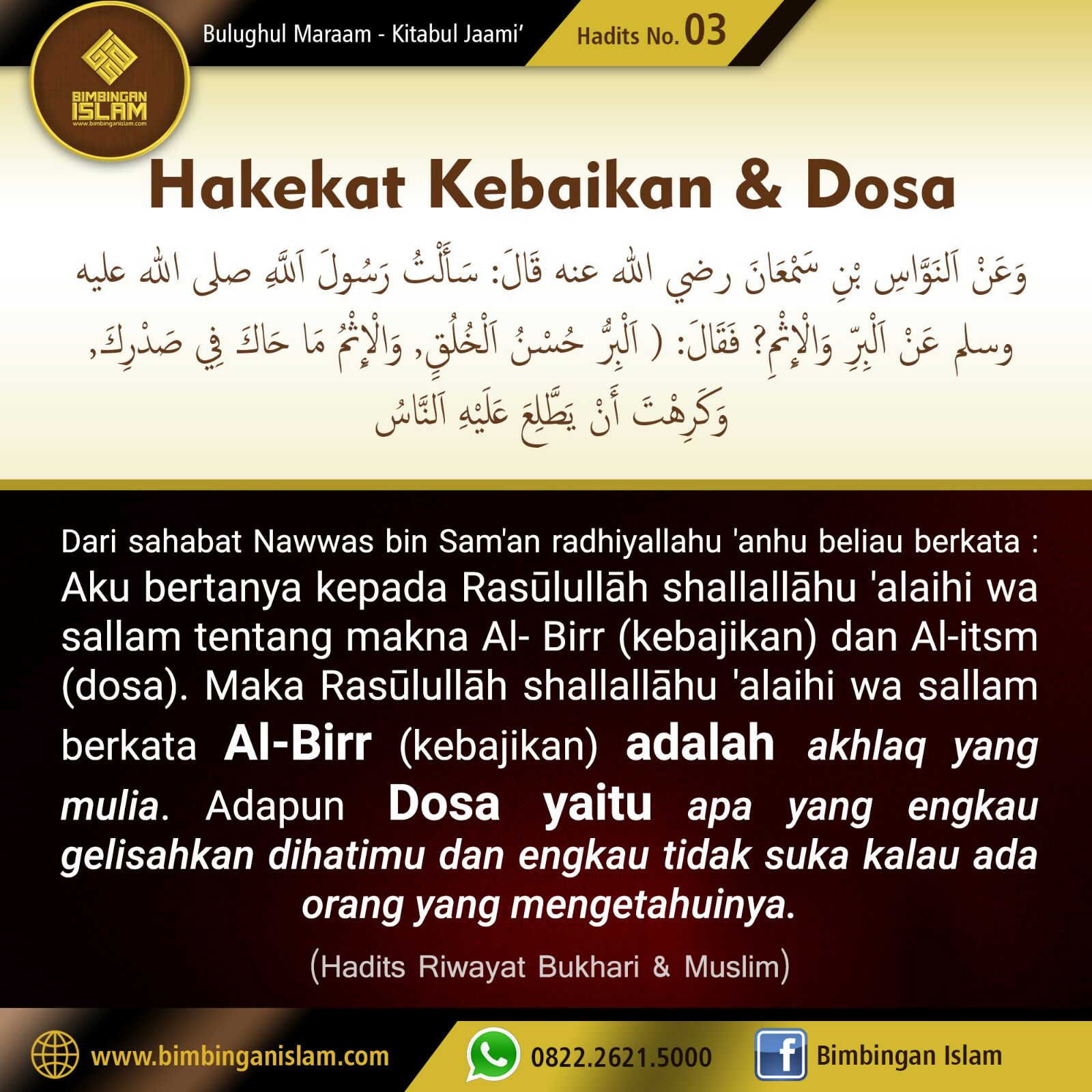 Aku bertanya kepada Rasūlullāh shallallāhu ‘alayhi wa sallam tentang makna AlBirr (yaitu kebajikan) dan itsm (yaitu dosa)-Apa itu kebajikan? Apa itu dosa?. Maka Rasūlullāh shallallāhu ‘alayhi wa sallam berkata AlBirr (kebajikan) adalah akhlaq yang mulia. Adapun dosa yaitu apa yang engkau gelisahkan dihatimu dan engkau tidak suka kalau ada orang yang mengetahuinya.