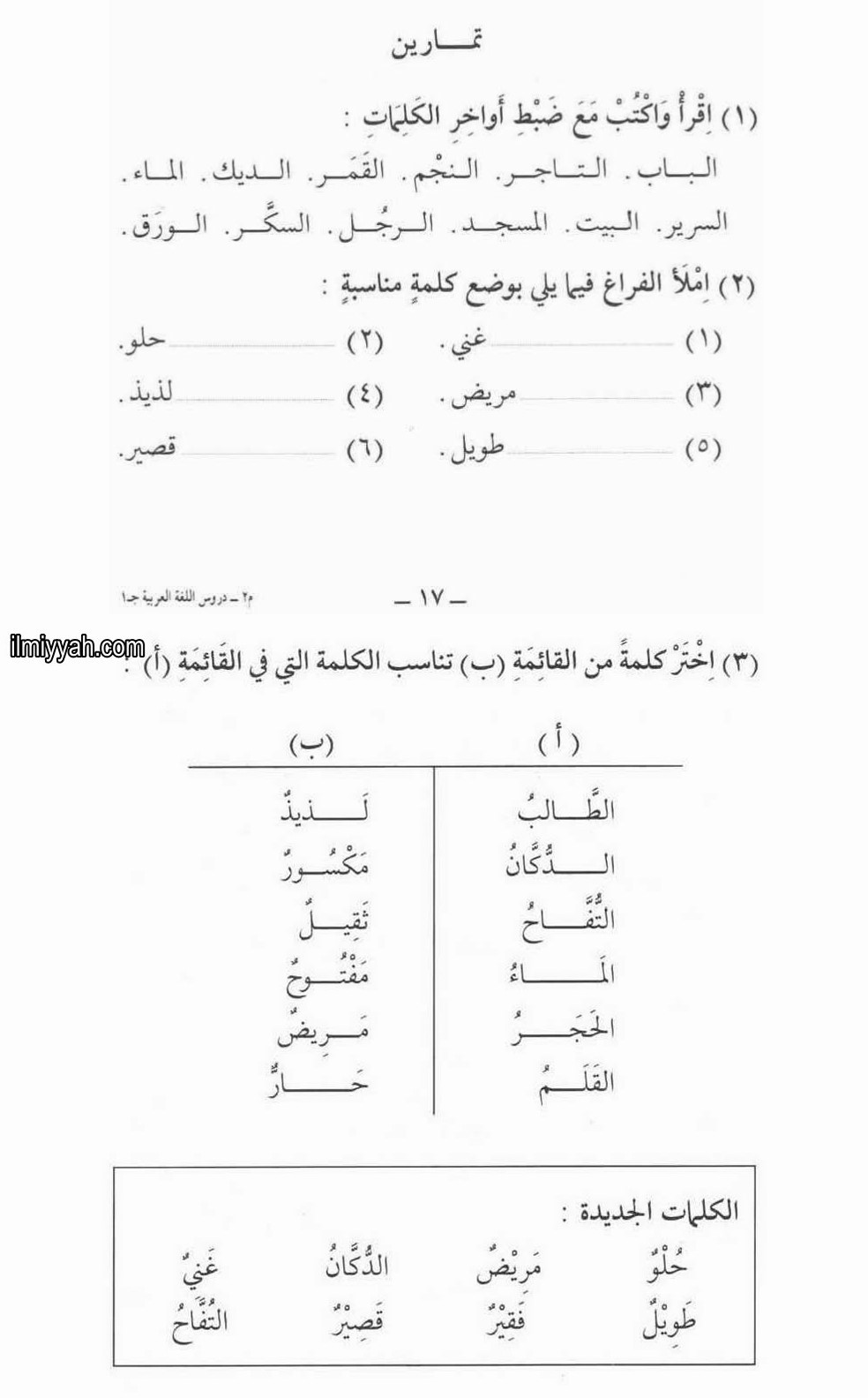 - (Latihan 1). Bacalah dan tulislah dengan akhiran yang benar. Contoh: مَسْجِدٌ (Masjidun dengan tanwin), الْمَسْجِدُ (Al-masjidu tanpa tanwin)